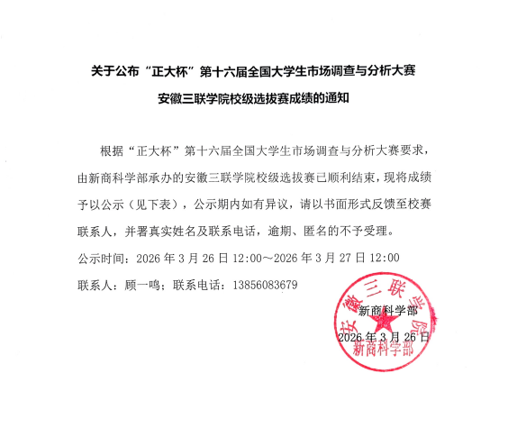 关于公布“正大杯”第十六届全国大学生市场调查与分析大赛安徽三联学院校级选拔赛成绩的通知