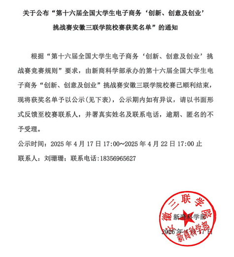 关于公布“第十六届全国大学生电子商务‘创新、创意及创业’ 挑战赛安徽三联学院校赛获奖名单”的通知