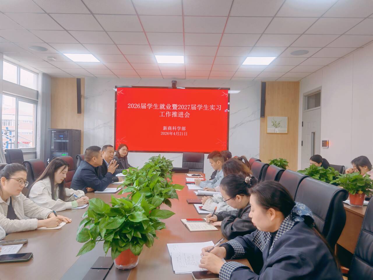 为扎实推进2026届毕业生就业及2027届学生实习工作,4月21日上午,新商科学部在A206会议室召开实习就业专题会议。学部副部长程学华、办公室主任洪志全、学管主任吴月星、王金丽及全体辅导员参会,会议由吴月星主持。